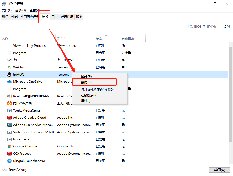 1、关闭电脑的开机自动程序,电脑有很多的程序都会自动设置开机自启动,这就导致电脑开机的时候这些不必要的程序也跟着启动,所以拖慢了电脑的开机速度。我们打开任务管理器,在启动这里禁用不必要的程序开机自启动即可。