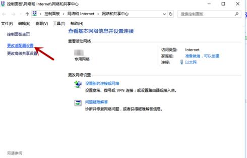打开网络共享中心后,再点击左侧的“更改适配器设置”。