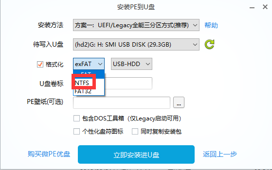 3.进入安装界面,选择磁盘格式为NTFS(为确保安全,请插入U盘是空白U盘,以防资料丢失)